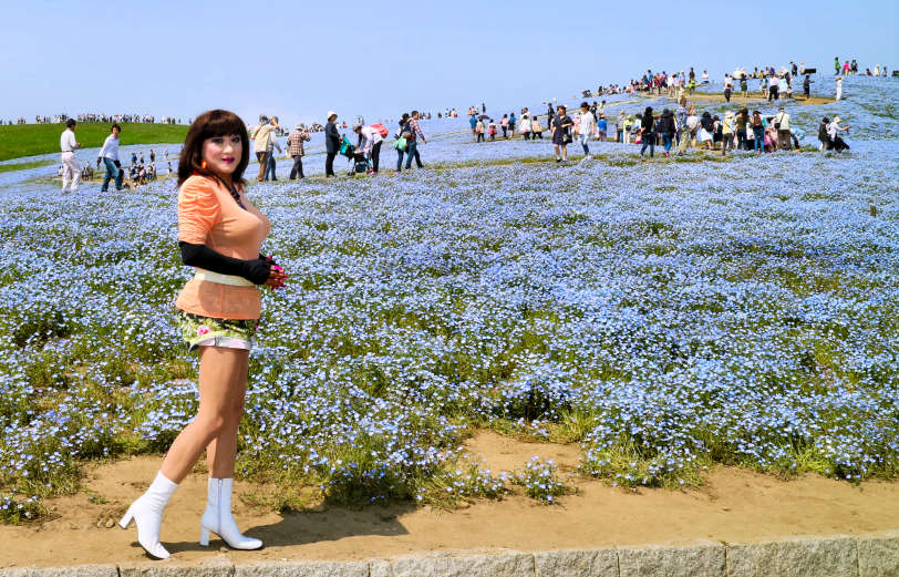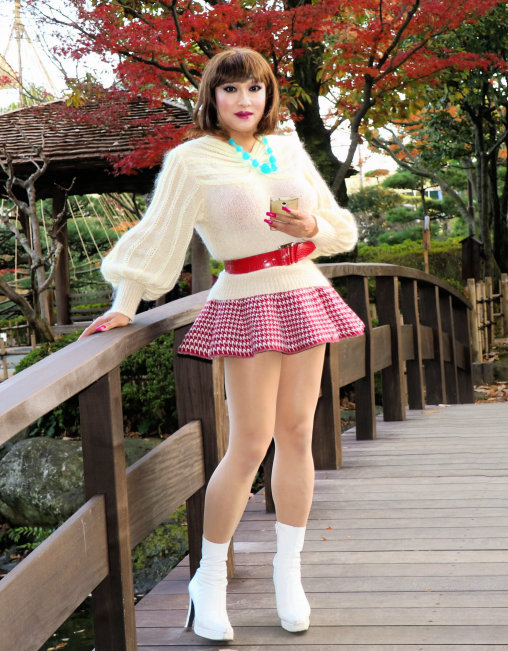 (2)帽子とミニスカとソックス。留美子さん独特のスタイル。