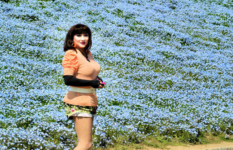 鮮やかなショッキングピンクのトップス。大輪の花柄のミニスカ。